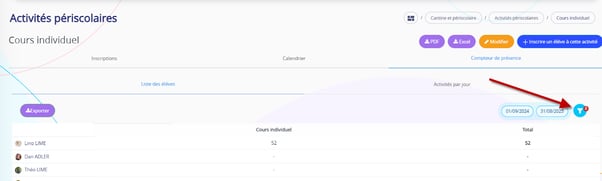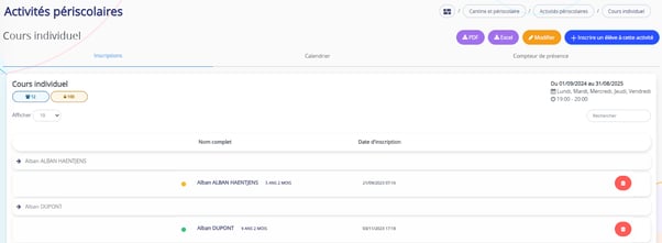 Lorsque je clique sur l’activité périscolaire j’ai également la possibilité de visualiser la liste des inscriptions