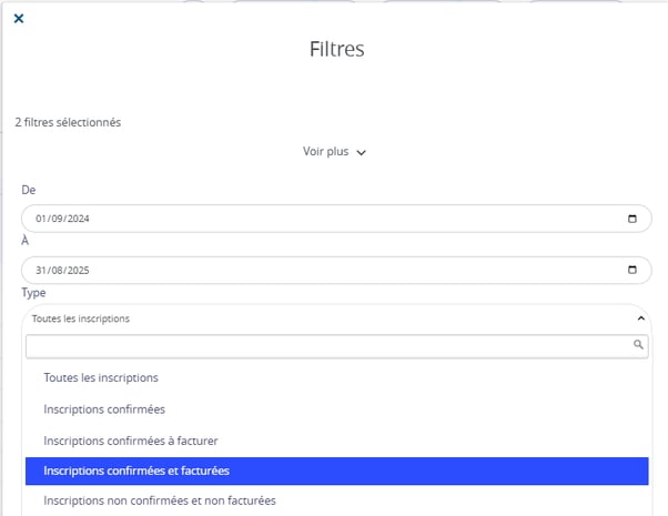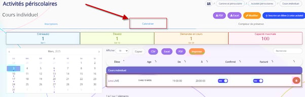Le calendrier me permet de visualiser les inscrits par jour, je peux ainsi confirmer la présence des élèves et indiquer si l'activité a été facturé.