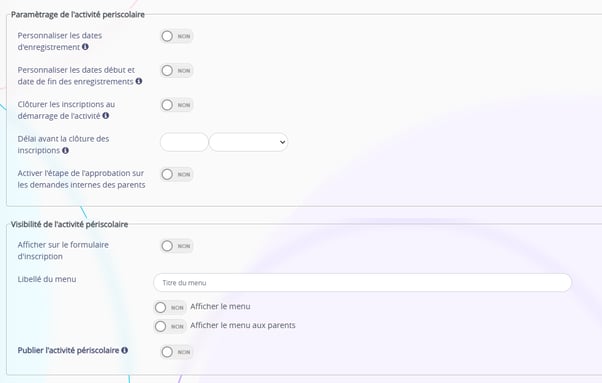 Avant d’enregistrer, il faut remplir le paramétrage de l’activité périscolaire ainsi que les paramètres de visibilité de l'activité. Les paramètres sont uniquement des boutons actifs à cocher ou non.
