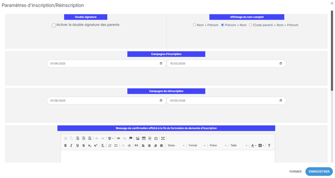 Je choisis la date de début et date de fin de mes deux campagnes d'inscriptions et de réinscriptions.