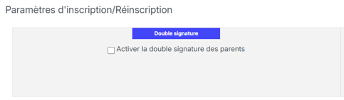 Disponible depuis la roue crantée dans le menu Inscriptions et réinscriptions, j’ai la possibilité d’activer ou non la double signature des parents.