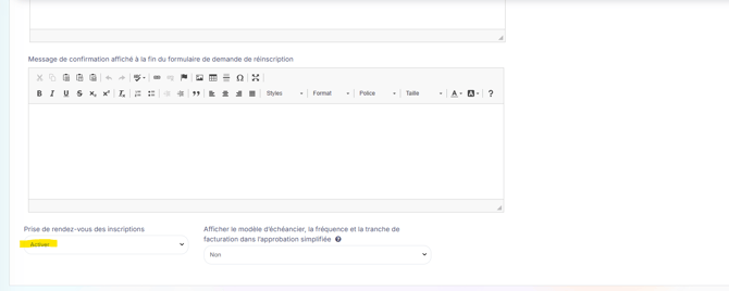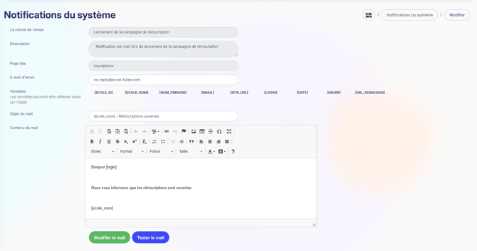 Depuis Statut des inscriptions du système dans les Paramètres, je peux activer la notification pour que les parents reçoivent une notification dès que la campagne de réinscription est ouverte. Je peux également modifier le corps du mail.