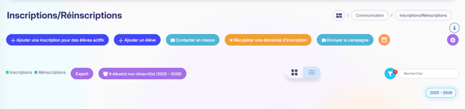 Depuis le menu Inscriptions / Réinscriptions du module Communication, je peux paramétrer mes campagnes, en cliquant sur la roue crantée située en haut à droite de l’écran.