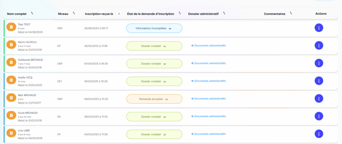 - Vos dossiers administratifs en cours : Vous pouvez classer et gérer efficacement les dossiers de vos élèves. Que ce soit en attente de signature, en cours de traitement ou incomplets, on vous offre la flexibilité nécessaire pour organiser et suivre chaque étape du processus d'inscription en un clin d'œil.