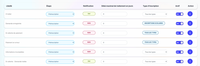 Vous avez la possibilité d’ajouter, de modifier, de masquer (curseur actif), ou de supprimer un statut d’inscription, et de choisir un délai maximal de traitement.