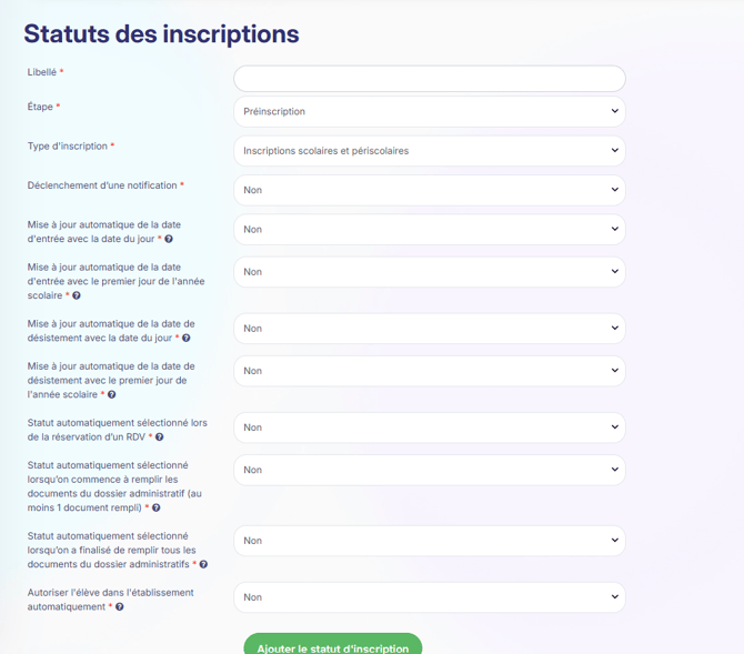 Le paramétrage des statuts est une étape cruciale du suivi des inscriptions, ce paramétrage permet de préciser les étapes que vous souhaitez mettre en place et, pour chaque étape, l’envoi ou non d’une notification aux parents.