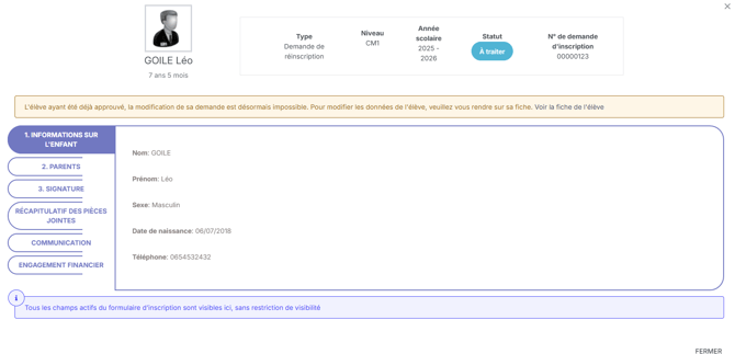 Vous pouvez visualiser l’ensemble des informations concernant l’élève et les informations complémentaires recueillies lors du formulaire.